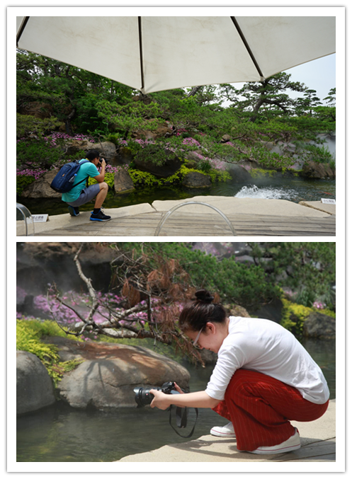 走入罗红摄影艺术馆,首先映入眼帘的是庭院内精巧的园林设计。时淡时浓的幽幽水雾似乎把人带入一方仙境。松柏、假山、瀑布、石桥、流水、花卉,还有水中五颜六色的锦鲤,对于摄影爱好者们来说,这一景一物本身就是很好的拍摄题材,眼前一切都成为了大家镜头中捕捉的对象,摄影协会成员们纷纷掏出“长枪短炮”——手机、微单、单反等,或伫立、或半蹲、或侧坐、或趴下……变换各种身姿,拿起相机寻找各种拍摄角度、力求最美的构图、苦思最新的创意,变换不同的方位尽情拍摄,记录下这犹如仙境一般的美景。