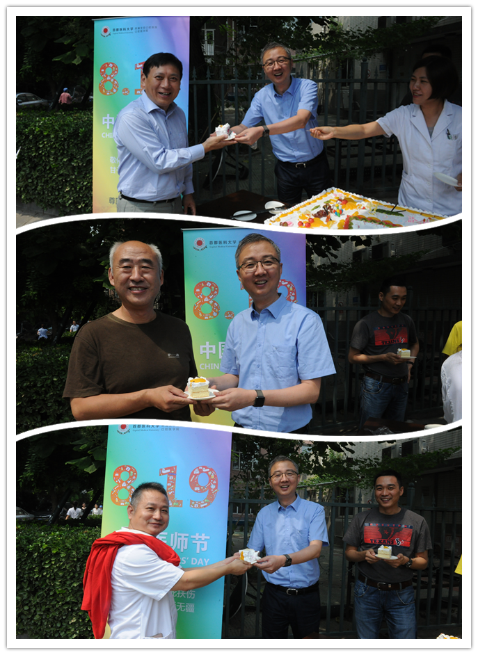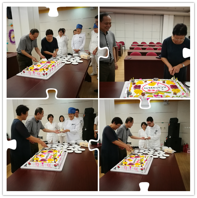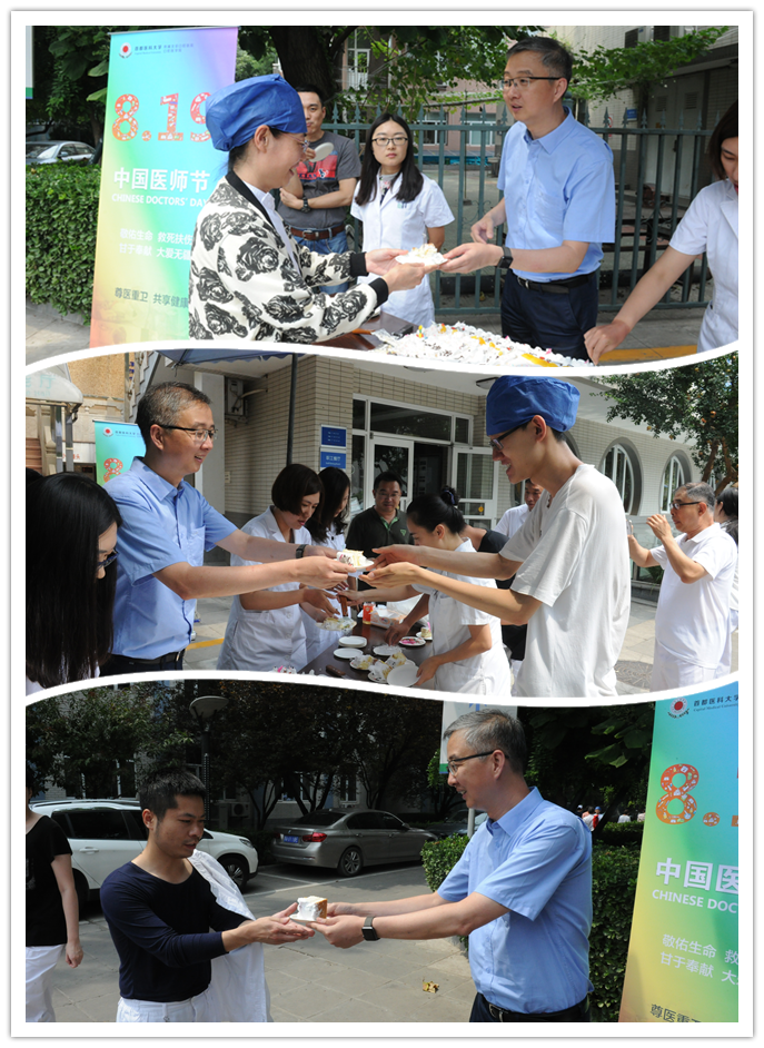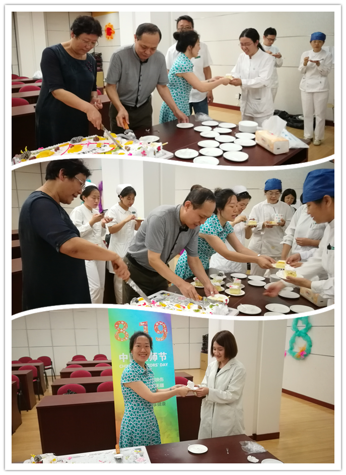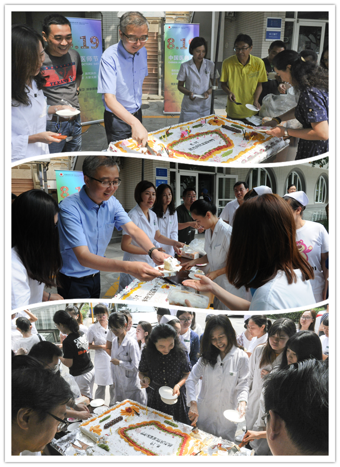 为庆祝首个“中国医师节”,8月17日中午,我院特开展“全院共分享”活动。院工会美食协会订制特大型蛋糕,分别在天坛部和王府井部两院区与广大医务人员同步分享。