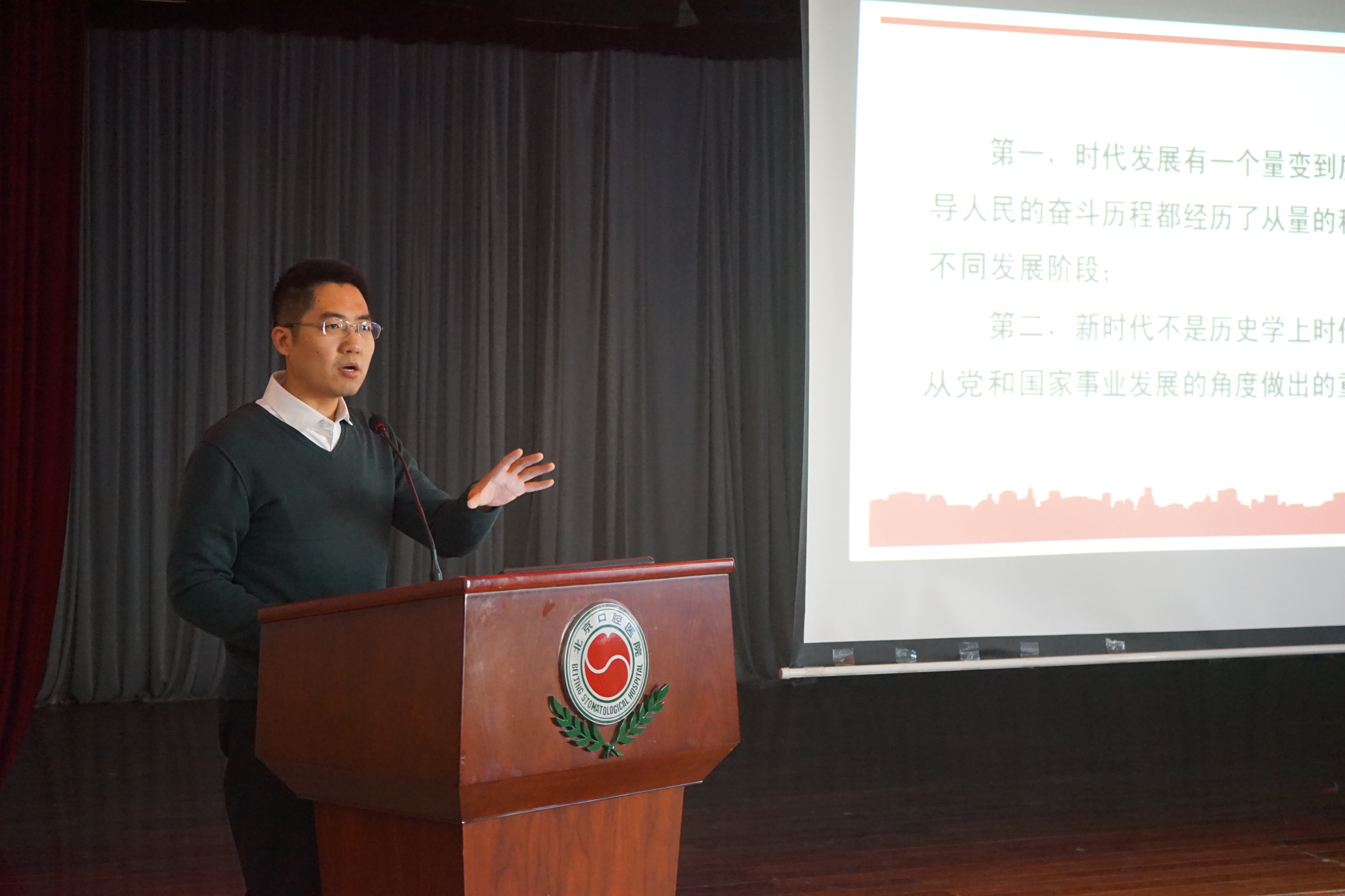 孙一平副教授以《习近平新时代中国特色社会主义思想的核心要义和丰富内涵》为题,结合当前时政热点与国际形势,详细阐释了在新的历史条件和时代背景下,坚持和发展中国特色社会主义的重要性和必要性。重点分析了习近平新时代中国特色社会主义思想的逻辑框架,通过回顾、对比、举例等方式生动详述这一思想体系的哲学基础、理论主题、治国方略、具体政策等,并总结概括了其在政治、历史、理论、实践等方面的重大意义。报告内容深入浅出,贴合实际,富有现实意义。