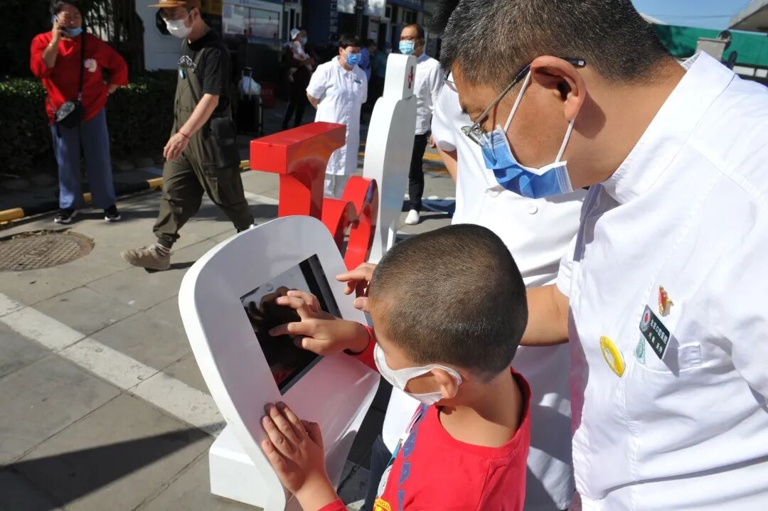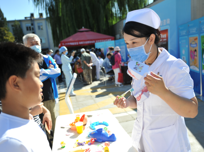 北京口腔医院在门诊楼前开展了多学科联合义诊咨询和护齿训练营活动,通过手把手教刷牙、IPAD小游戏等互动体验项目,让前来参与的患者和市民了解口腔保健知识,提高健康素养。