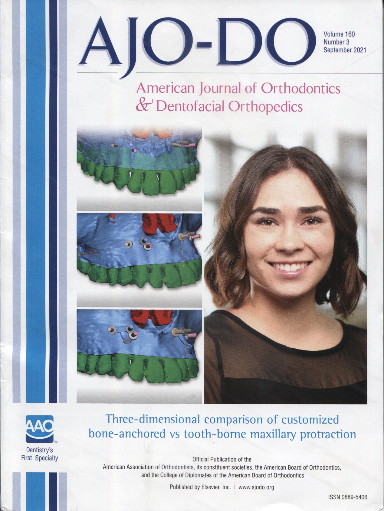 近日,我院白玉兴教授研究团队在国际权威正畸学期刊《美国正畸学与牙面矫形学杂志》(American Journal of Orthodontics and Dentofacial Orthopedics,AJO-DO,2021;160:374-84)杂志发表论文《Three-dimensional comparative evaluation of customized bone-anchored vs tooth-borne maxillary protraction in patients with skeletal Class III malocclusion》,并被选为封面文章。论文第一作者为梁舒然医师,通讯作者为白玉兴教授,署名单位为首都医科大学口腔医学院。