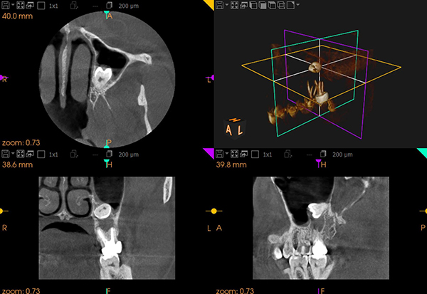 2023年12月5日,一位常年旅居国外的患者因左上后牙反复肿痛,辗转多家医院,最终慕名来到我院口腔显微诊疗中心知名专家侯本祥教授处就诊。经检查发现,患者左上第二磨牙根管治疗冠修复后出现慢性根尖周炎症,同时左侧上颌智齿位于第二磨牙的根尖上方的上颌窦内,且根尖周病变与智齿相连。