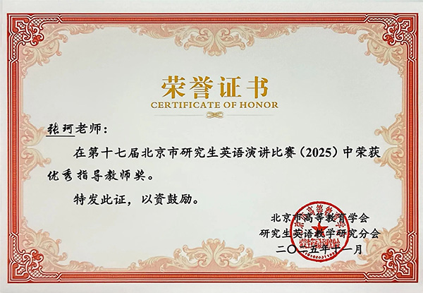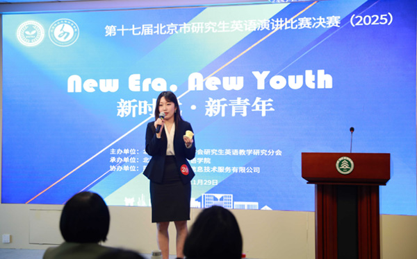 近日,第十七届北京市研究生英语演讲比赛总决赛圆满落幕,我院2020级长学制学生贾梓涵围绕“新时代·新青年”主题,以自信的姿态、深刻的见解和出色的发挥脱颖而出,荣获一等奖,指导教师张珂荣获优秀指导教师奖。
