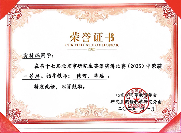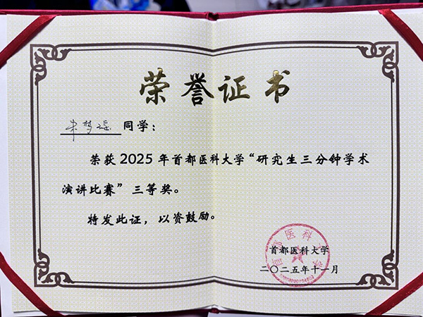 此前,在2025年首都医科大学研究生英语演讲比赛中,贾梓涵荣获一等奖。
