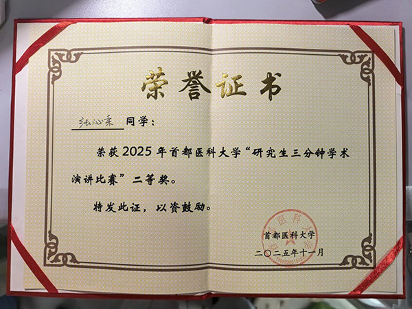 在2025年首都医科大学研究生三分钟学术演讲比赛中,我院2023级硕士研究生张沁柔荣获二等奖,2023级博士研究生朱梦瑶荣获三等奖。